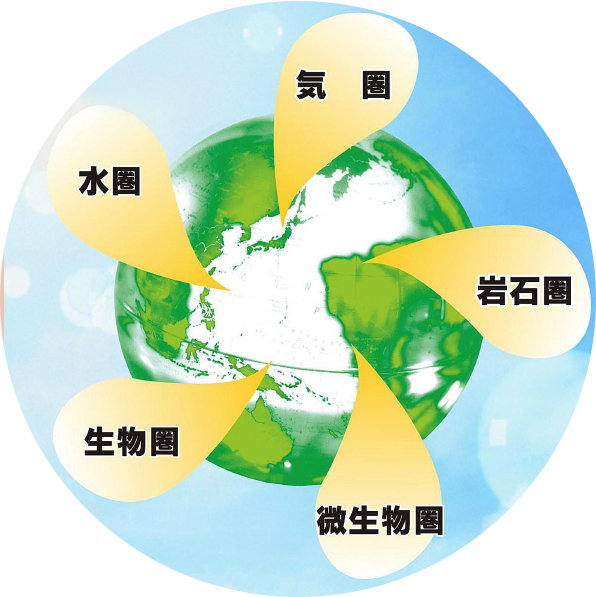私たちは地球規模でみると 「5つ 環境」( 気圏、 水圏、 岩石圏、 生物圏、 微生物圏)の中で生活しています。
